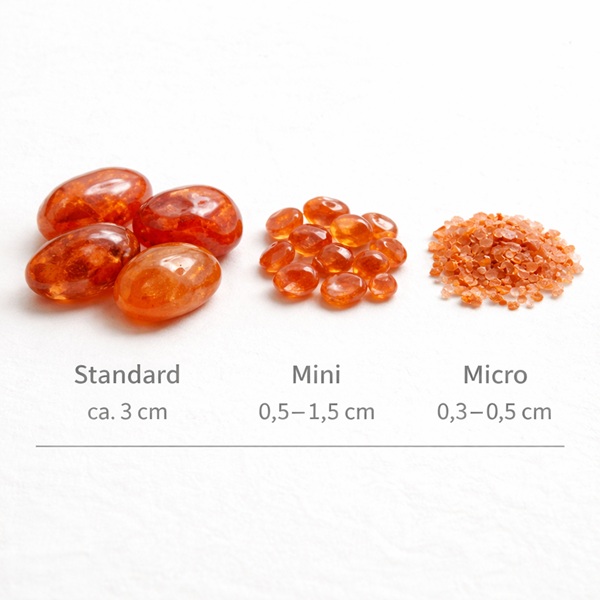Unsere getrommelten Karneole in A-Qualität sind sorgfältig ausgewählt und in verschiedenen Größen erhältlich – Micro, Mini oder als größere Trommelsteine. So kannst Du Dein Edelsteinwasser ganz individuell zusammenstellen.